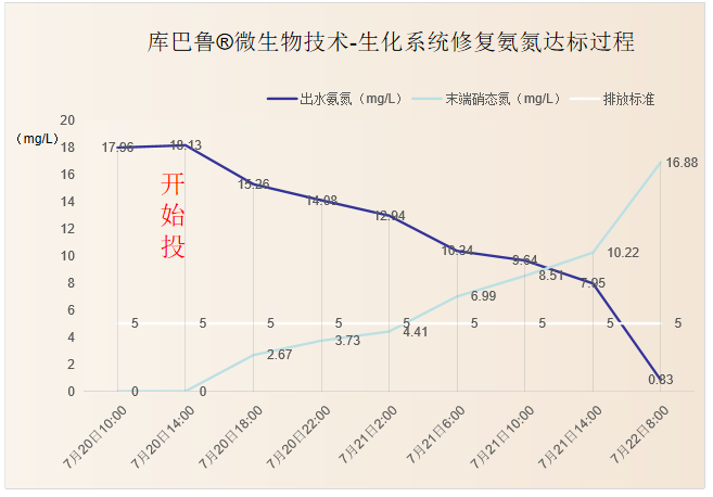 山東某工業混排污水廠生化系統受沖擊,庫巴魯微生物技術團隊第一時間抵達現場調試,使用“特種兵”氨氮激活菌,將滿負荷運行硝化為零的生化系統修復提升,用時32小時,氨氮出水穩定在1mg/L以下。